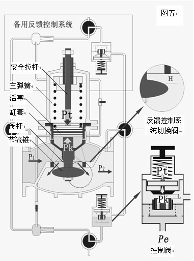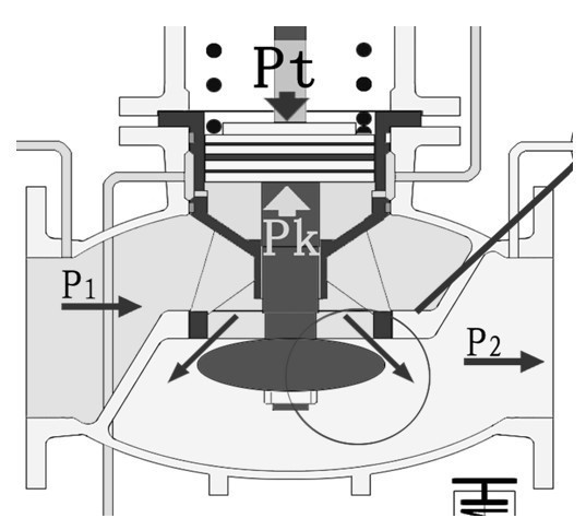 當(dāng)P1上升時(shí),減壓閥的P2+ΔP2首先表現(xiàn)為上升,其值通過反饋系統(tǒng)出口管傳到控制閥,使Pt′+ΔPt′,ΔPt′與Pk′的力達(dá)到新的平衡,控制閥h減?。幌鄳?yīng)ΔPk′壓力增大,經(jīng)壓力導(dǎo)管,使主閥的Pk+ΔPk,Pt=Pk+ΔPk壓力達(dá)到新的平衡,主閥h減小、ΔP2值恢復(fù)為原P2值。當(dāng)進(jìn)口壓力P1下降時(shí),主閥與控制閥的工況則與上述的工況相反。